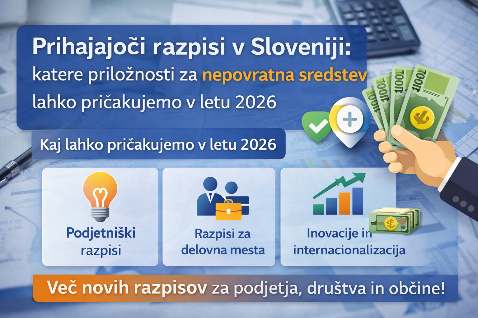 V Sloveniji se vsako leto objavi več deset javnih razpisov, ki podjetjem, društvom, občinam in drugim organizacijam omogočajo pridobitev nepovratnih sredstev ali drugih oblik razvojne podpore. Tudi leto 2026 prinaša številne nove priložnosti, predvsem na področju podjetništva, inovacij, regionalnega razvoja in trajnostnega gospodarstva.